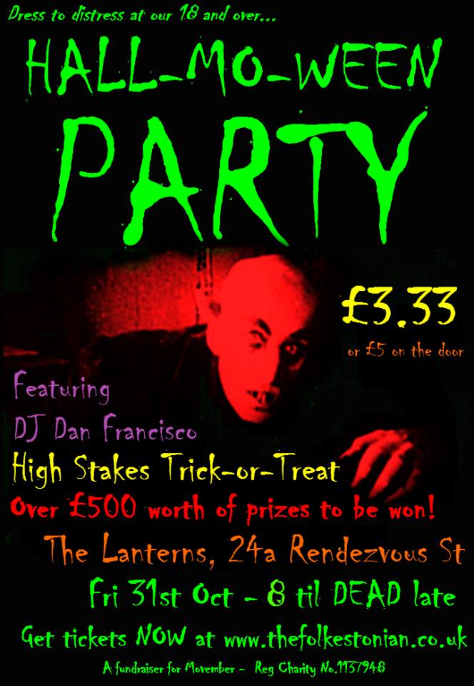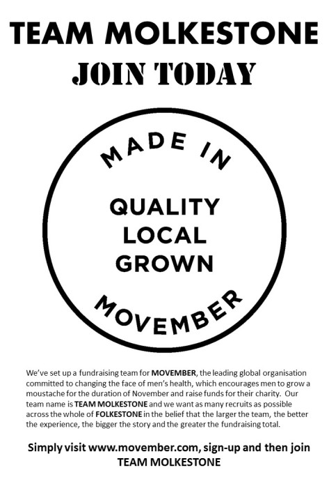 “Hi Guys. We’ve put a Movember group together for Folkestone called Team Molkestone anyone from Dover and beyond is more than welcome to join our team. Loads of information and links on the website including a hall-mo-ween party and a screening of Pulp Fiction! Cheers Tom” =