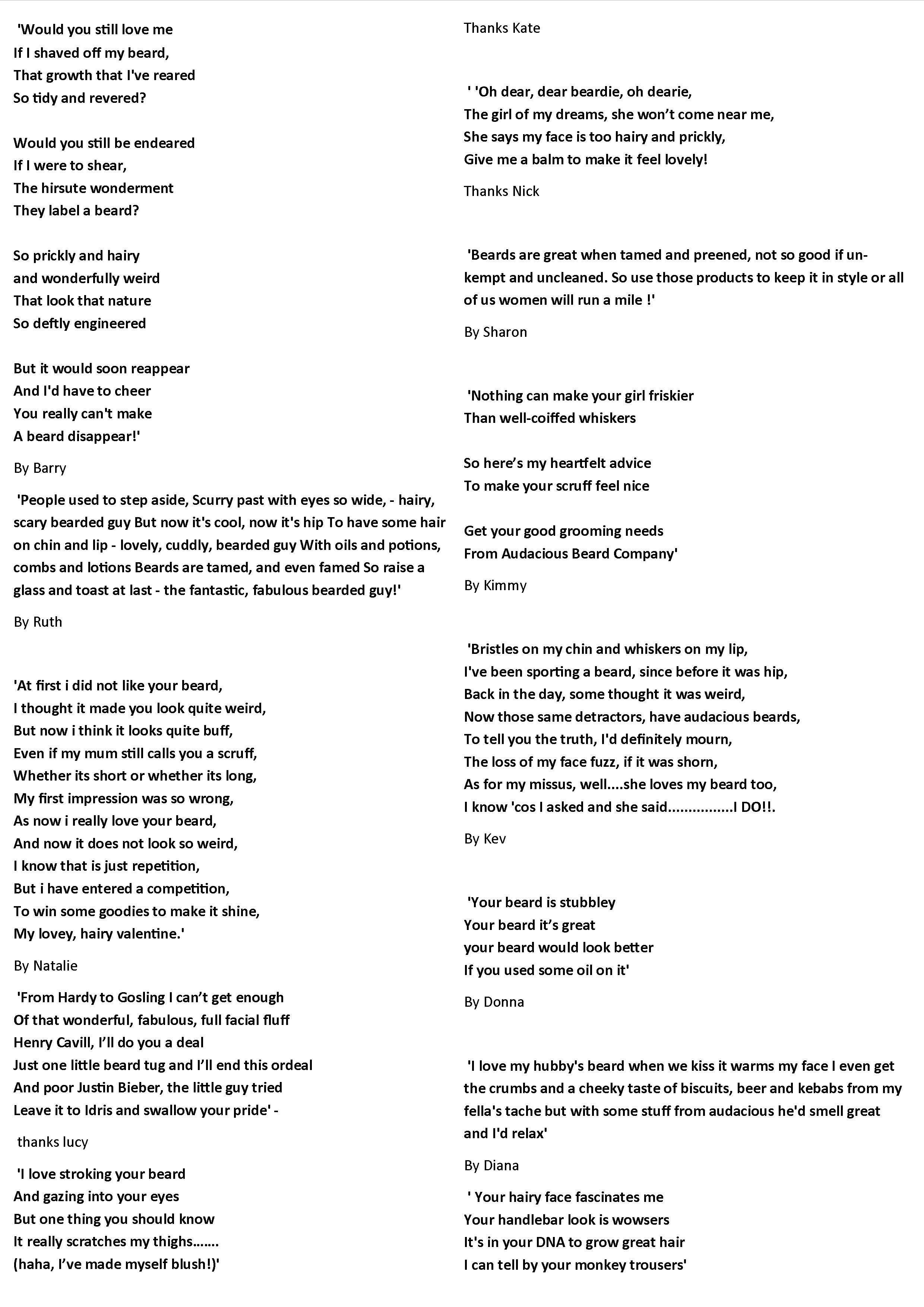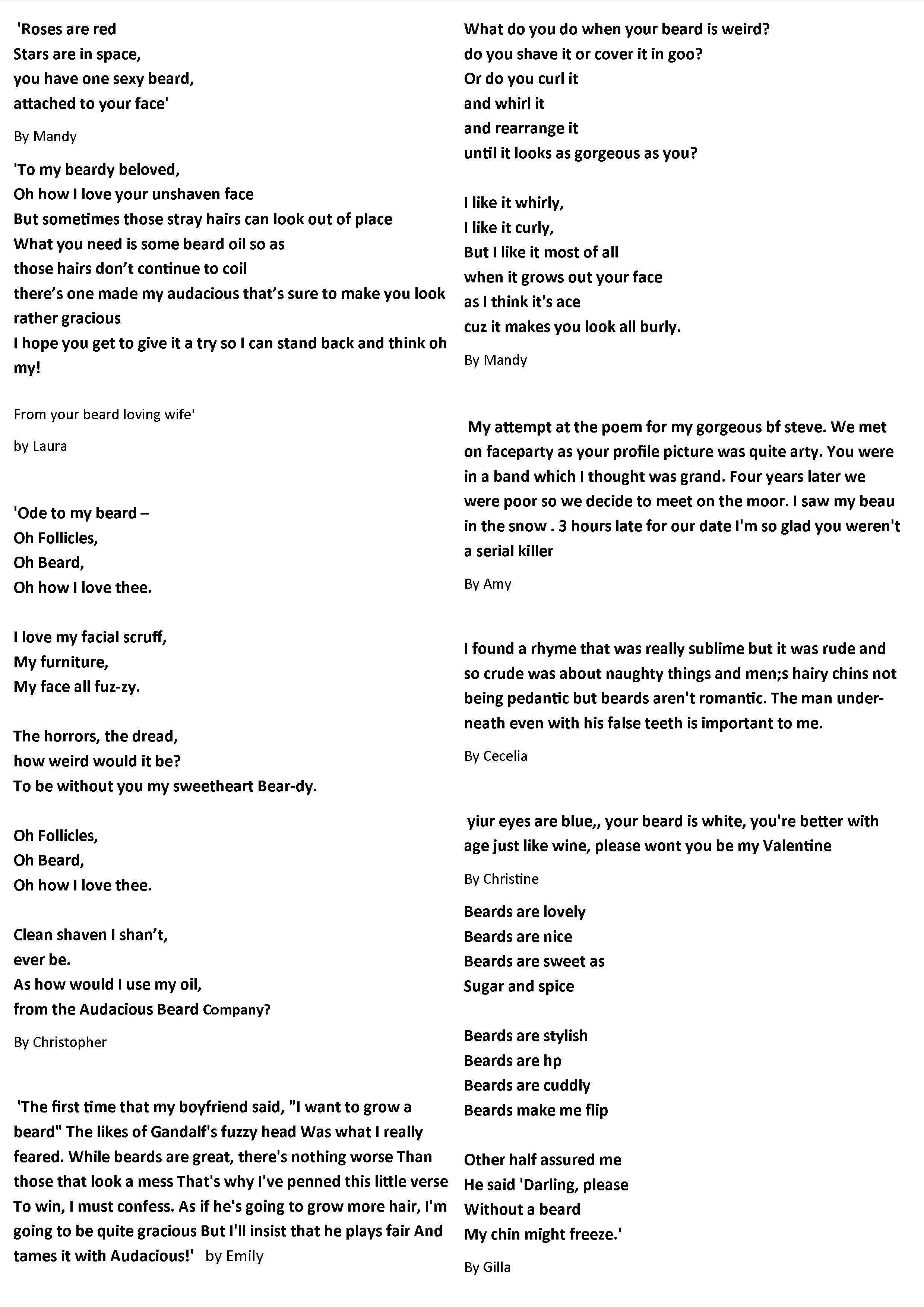 Lola McWellington is the winner of our 2015 Valentine gift set competition. To celebrate Valentine’s day and the beards you love, our competition required all you wordsmiths to write a (clean) little love ditty. We loved reading all your entries but think you will agree Lola’s wordsmithery is perfect: